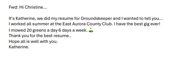 "We did my resume for Groundskeeper and I wanted to tell you, I worked all summer at the East Aurora County Club. I have the best gig ever! I mowed 20 greens a day, 6 days a week!